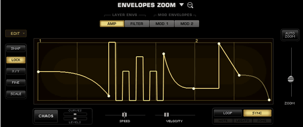 Окно Envelope Zoom включает специальную функцию CHAOS для рандомизации формы огибающей. Функции Chaos могут устанавливаться для автоматического изменения каждого цикла, создавая постоянно изменяющиеся огибающие. Степень, с которой функция CHAOS затронет Огибающую, определяется с помощью специализированных минислайдеров. Можно также создать огибающую Groove Lock™ простым перетаскиванием стандартного MIDI файла (например, из Stylus RMX), в область отображения Огибающей. При этом автоматически создается ритмическая огибающая, соответствующая груву, содержавшемуся в MIDI файле.