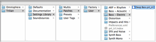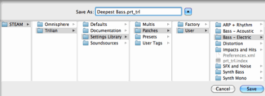 Браузер разработан для управления поиском, просмотром, загрузкой и сохранением звуков. Пользовательскими Патчами или Мультиинструментами управляет встроенный файловый менеджер Вашего компьютера (Mac Finder или Windows Explorer). По умолчанию местоположение для сохранения Патчей, в папке с названием "User", расположено в .../STEAM/Trilian/Settings Library/Patches/User. По умолчанию местоположение для сохранения Мультиинструментов, в папке с названием "User", расположено в: .../STEAM/Trilian/Settings Library/Multis/User. Можно создать дополнительные папки в этих местоположениях и дать им свое название. При создании новой папки на высшем уровне (рядом с папкой User), она отображается в выпадающем меню DIRECTORIES в соответствующем Браузере.