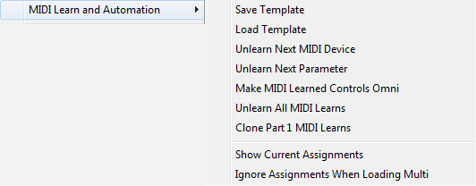 Меню Utility включает параметры функции MIDI Learn и параметры хост-автоматизации, которые применяются к плагину в целом. Подробнее смотрите параграф "Функция MIDI Learn & Параметры Хост-автоматизации".