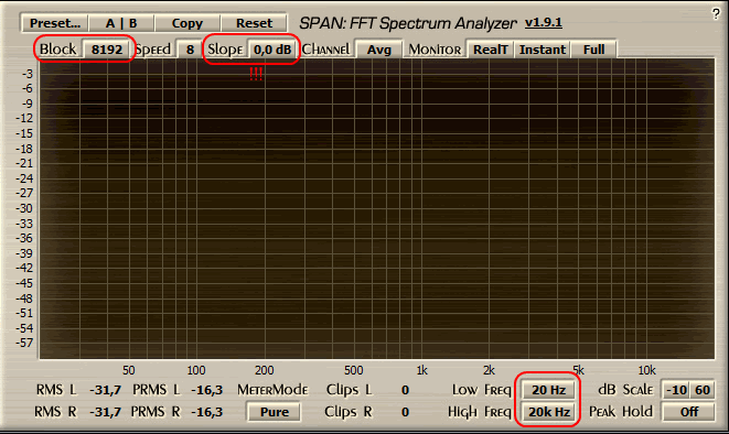 Если вы только начинаете изучать анализ звука, то в Voxengo SPAN поставьте значения как на рисунке ниже, это облегчит изучение: