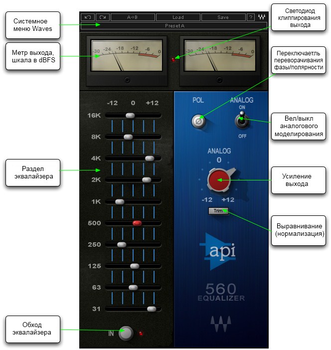 Смоделированный по образцу классического API 1967 года, API 560 это 10-полосный эквалайзер, полосы которого разделены с интуитивным шагом в одну октаву. Его особенность это точная фильтрация и высокая динамика, идеально подходящая для усиления сигнала и настройки комнаты. 560 не имеет равных в потенциале формирования кривой, потому как разработан с использованием уникальной "Пропорциональной Q" API, интуитивно расширяя полосу пропускания фильтра при низких уровнях усиления и сужает её при более высоких значениях. И потому как характеристики усиления и вырезания идентичны, предыдущие действия могут быть легко отменены.