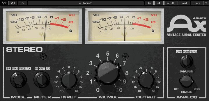 Продюсер/звукорежиссёр Val Garay, одним из высококлассных специалистов, которые способствовали популяризации оригинального Aural Exciter, послушал прототип плагина и подтвердили, что звук нашей программы отлично соответствует аппаратному устройству. Однако он также сказал нам, что он всегда использовал устройство в качестве вспомогательного эффекта посыла/возврата в AX режиме. Установка aux посыла/возврата обеспечивала "звук", который навсегда запечатлелся в хитовых записях конца 70- х и начала 80- х годов. Поскольку сегодняшние пользователей предпочитают вставлять плагин прямо на трек, мы хотели сделать этот звук посыла/возврата доступным в режиме вставки (insert). Для удобства пользователя мы решили предоставить оба звучания в режиме вставки (insert), добавив дополнительный режим MIX. Это режим мы назвали MIX1.