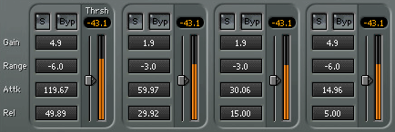 3. Threshold (порог) - определяет точку, вокруг которой состоится динамическое изменение уровня, другими словами центральная точка параметра Range. Этот параметр может быть изменён путём перетаскивания вертикального треугольника рядом с оранжевым измерителем громкости. Каждый измеритель показывает фактический уровень громкости этой полосы (так что если полоса очень низкая, высокая, или узкая, уровень в этой полосе будет скорее всего низкий). Это делает очень лёгким установку порогового значения; просто перетащите треугольник вниз, в пределах диапазона движения оранжевого измерителя. Значение порога отображается в верхней части измерителя. Вы также можете ввести значение в это поле, или перетащить непосредственно его, как описано в руководстве WaveSystem. Обратите внимание, что только первая полоса помечена надписью Thrsh. Нет смысла загромождать такой приятный пользовательский интерфейс, да?
