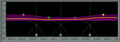 Над жёлтой линией имеется 4 цветных маркера, представляющих каждую полосу, которые влияют на несколько значений параметров. Перетаскивание любого маркера может одновременно изменить значения 3х параметров. Горизонтальное перемещение изменит центральную частоту полосы (путём изменения точек кроссовера, связанных с этой полосой). Обратите внимание, что изменение центральной полосы также будет изменять соседней полосы.
