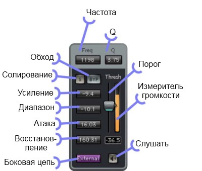 - Кнопка прослушки (с динамиком) - используется для мониторинга сайдчейн сигнала. В этом режиме вся динамическая обработка отключаются, и становится "серой".