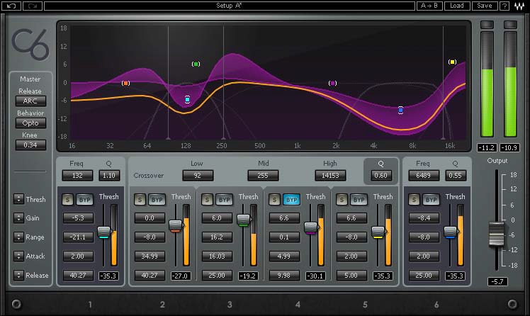 C6 это шести-полосный компрессор с параметрическим интерфейсом. C6 сочетает в себе возможности многополосной компрессии, эквализации, лимитирования, экспандирования и де-эссера в едином простом интерфейсе. C6 полезен, когда вам необходимо выполнить различную эквализацию и динамическую обработку в различных диапазонах сигнала.