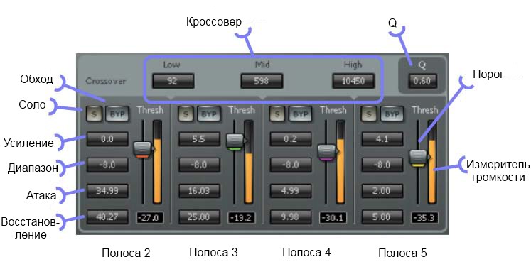 - Gain (усиление) - управляет усилением на выходе компрессора каждой полосы, на графике обозначен светлым краем фиолетового диапазона.