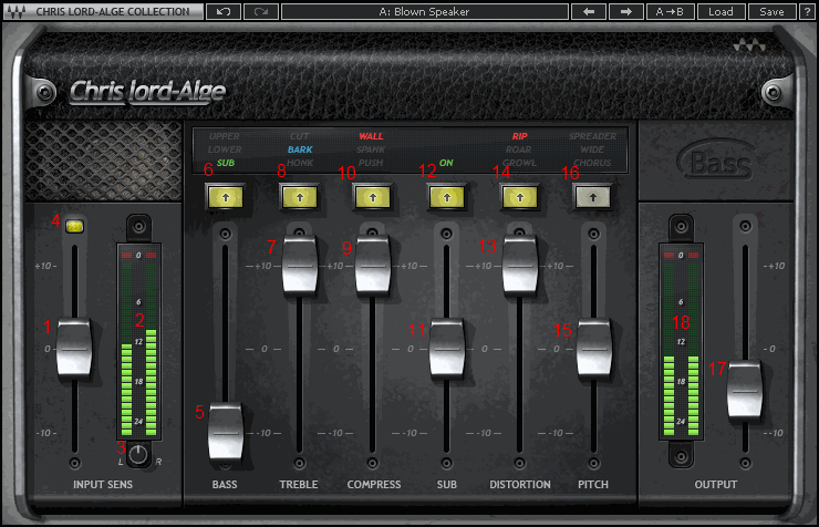 • Диапазон значений: чисто (заглушено), зелёный (Growl - рычание), синий (Roar - рёв), красный (Rip - рвань).