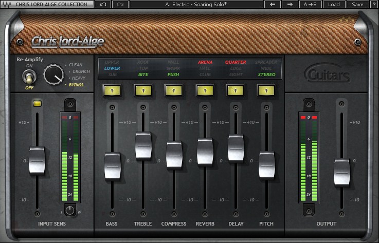 Два слова, описывающих плагин CLA Guitars: Мгновенное удовлетворение. Каждый раз, когда я подключаю свою секиру, я просто не могу остановится играть! Он быстро и легко обеспечивает звучание гитары которое я использовал в треке Green Day от Daughtry! Это похоже на панель инструментов со всеми необходимыми комбинациями для гитары. Плагин имеет три режима - Clean, Crunch и Heavy - с режимами DI и Re-amping для каждого. Вы получаете три цвето-закодированных пресета для шести самых важных эффектов, чтобы получить идеальное сочетания низких и высоких частот, компрессии, реверберации, дилэя и хоруса/удвоения.