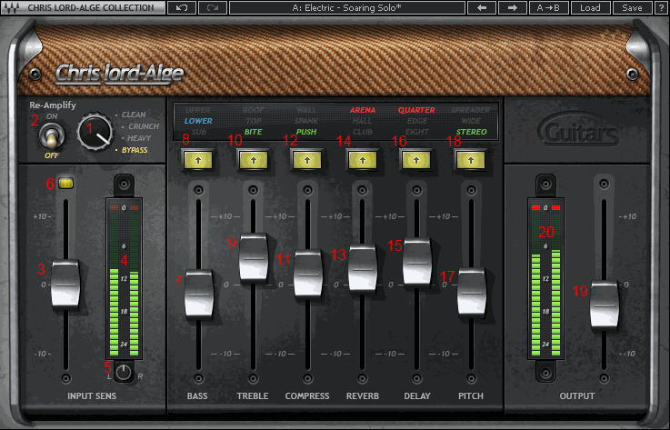Особенность плагина CLA Guitars это переключатель режимов гитар, которые касаются наиболее распространенных вкусов гитары: Clean, Crunch, Heavy, и Bypass.