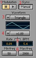 - Sync (синхронизация) - при выборе ручной синхронизации (Manual) скорость модулятора устанавливается полностью вручную. При выборе автоматической синхронизации (Auto) скорость модулятора соответствует темпу проекта, и параметры скорости перестают быть доступными, доступен только множитель.