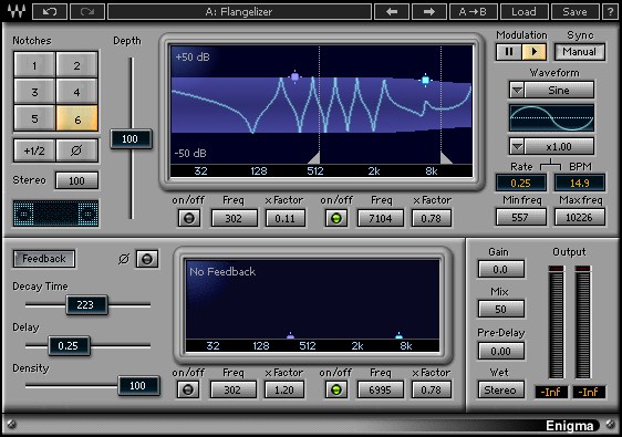 Enigma можете создавать вырезы в сигнале, как это делают несколько флэнжеров и фэйзеров, но с некоторыми дополнительными возможностями: есть реверберационный тип процессора, цикл обратной связи, LFO, фильтры в разных местах, и некоторые интерактивные параметры которые трудно описать (иногда они работают очень по-разному, в зависимости от настроек). Вот почему мы дали этому процессору название Enigma.