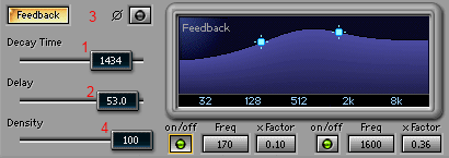 После раздела вырезов, сигнал поступает в раздел обратной связи (нижняя часть окна), этот раздел не является традиционной линией задержки или реверберации, он больше представляет собой генератор эхо/отражений. Он намеренно имеет грубо разделённый звук, так чтобы вы могли получить отдельные эхо и т.п., в отличие от гладкой структуры реверберации. Параметры находятся в левом нижнем углу, в их числе Delay, Decay Time, Phase, и Density.