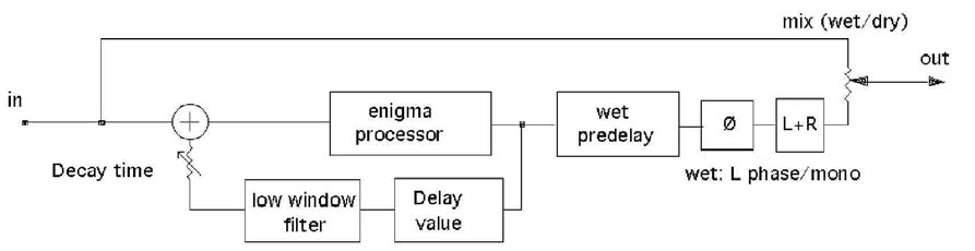 Хотя данный процессор первоначально разрабатывался в ходе исследований для устройств типа флэнжера и фэйзера, Enigma это процессор который сочетает в себе несколько уникальных небольших обрабатывающих разделов, которые дают свежие звуки, большинство из которых ранее не были слыханными. С помощью специальной цепи, которая производит вырезы (чем-то напоминающие фэйзер или флэнжер) и низкоуровневой реверберации/отражениям/зацикленной обратной связи, а также модулятору в цепи, производятся некоторые звуки, которые очень напоминают сложную зацикленную обратную связь использующую реверберацию, очень короткую задержку, и банки фильтров, используемых в классической электронной музыкальной студии. Такие студии пришли из композиторского развития в 1950 году и буквально склеивали каждый звук. (Отличная книга на эту тему Joel Chadabe’s Electric Sound: The Past and Promise of Electronic Music, см. www.emf.org).