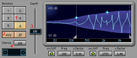 - Depth (глубина) - управляет глубиной вырезов в процессоре Enigma. При установке на ноль, основной областью управления является раздел обратной связи (хотя и не полностью)! Кнопка фазы (правее кнопки +1/2) меняет полярность в вырезах (ориентацию верх/низ).