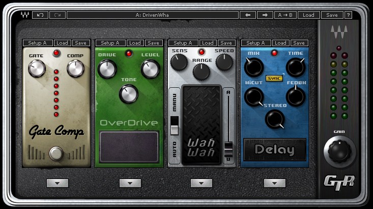Waves GTR Stomp представляет собой виртуальный плагин педальной панели, который содержит несколько ножных эффектов. Ножные эффекты можно выбрать, нажав на кнопку под слотом, или щёлкнув правой кнопкой мыши по пустому слоту. После загрузки, ножной эффект может быть изменён путём их перетаскивания на новое место.