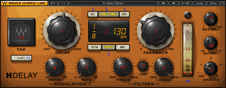 • В режиме Host, плагин H-Delay отображает текущий BPM секвенсора. Чтобы изменить темп вручную, переключиться в режим BPM.