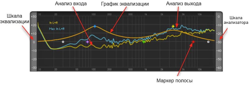 • Маркеры полос - позволяют управлять полосами эквалайзера. Каждый маркер соответствует определенной полосе и имеет цветовую маркировку.