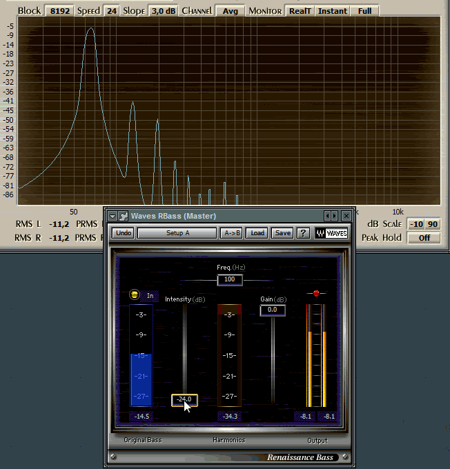 Работает по принципу: берётся самый низкий бас (определяется пользователем) и создаются гармоники, которые могут быть добавлены к сигналу (регулируется пользователем). Компания Waves запатентовала эту технологию, усовершенствовала её и применила в процессоре Renaissance Bass. Но процессор RBass был существенно усовершенствован. Сигнал в нём идёт слева направо, так что очень просто проследить, как оригинальный басовый сигнал и новые гармоники формируют общий выходной сигнал. С левой стороны находится индикатор уровня Original Bass (оригинальный бас).