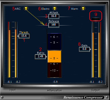 - Attack - время за которое компрессор начнёт работать в полную силу;