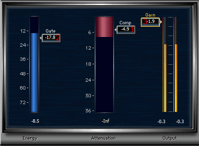 Каждый раз, когда Gate "закрывается", на красном метре отображается сила подавления сигнала. Сила сжатия также отображается на этом метре, вполне возможно, что метр постоянно будет показывать некоторое сжатие, на протяжении всего времени.