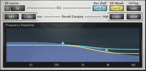 Как указывалось ранее, ранние отражения и реверберация могут иметь различные частотные характеристики. ER Absorb отвечает за поглощение ранних отражений. Он отображается на график АЧХ в виде жёлтой линии. ER Absorb определяет, как в ранних отражениях поглощаются высокие частоты.