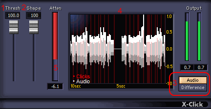 - Click Scope - дисплей обеспечивает визуальную обратную связь истории обработки в течение последних 10 секунд. Красный цвет означает обнаруженные щелчки, интенсивность цвета соответствует степени удаления. Сэмплы затрагиваемые X-Click окрашены серым цветом. Более высокие значения Threch дают больше красного цвета (щелчков), но возможно появление аретефактов.
