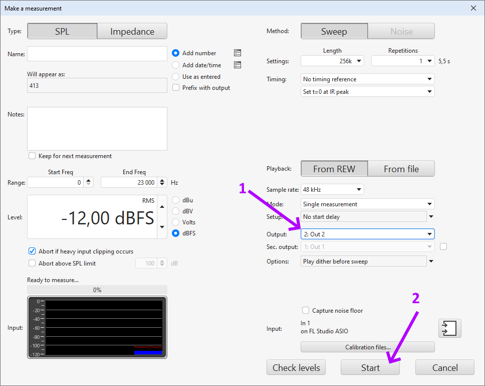 В появившемся окне установите (1) Start Freq (начальная частота) в значение 0, (2) End Freq (конечная частота) в значение 22000, (3) Length (длина) в значение 256k. Нажмите по кнопке (4) Calibration files... (калибровочные файлы) и в появившемся окне укажите путь к калибровочному файлу вашего микрофона (5) см. картинку ниже. В данном замере подойдёт файл калибровки 30.txt, этот калибровочный файл сделан под углом 30 градусов.