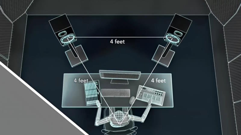 Для того, чтобы выровнять АЧХ в вашей комнате, первое, что нужно сделать, это определить точки замера. На картинке ниже вы видите классическую схему расположения мониторов в равностороннем треугольнике.
