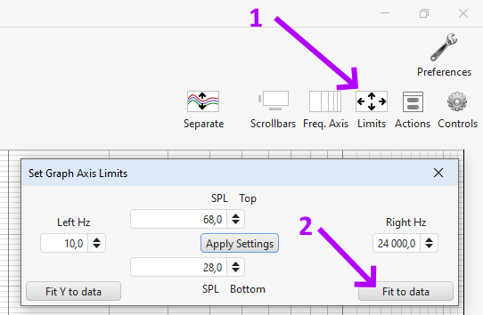 Если вы не видите графики воспользуйтесь (1) Limits (границы), затем нажмите по (2) Fit to data (соответствие данным).