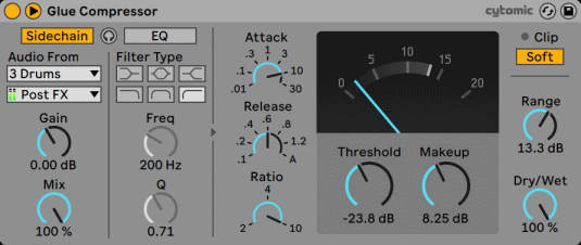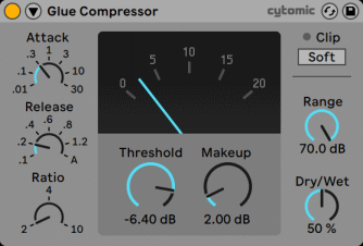 Glue Compressor это аналогово-смоделированный компрессор созданный в сотрудничестве с Cytomic, и он основан на классическом шинном компрессоре из знаменитого микшерного пульта 80х. Как и оригинальный Compressor Live, Glue Compressor может быть использованы для основного контроля динамики отдельных треков, но в основном он предназначен для использования на мастер треке или группе треков «склеивая» несколько источников вместе в единое звучание микса.