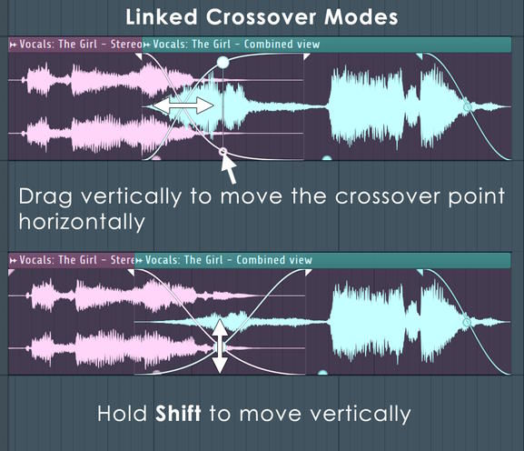 *'''Натяжение кроссфейда (связанный и несвязанный режимы)''' - когда для натяжения кроссфейдов перекрывающихся клипов установлено одинаковое значение, ручки становятся связанными и перемещаются вместе особым образом. Перетащите вертикально, чтобы переместить точку пересечения влево (вниз) и вправо (вверх), сохраняя одинаковую громкость. Удерживайте ({{Ярлык|Shift}}), чтобы изменить вертикальное положение кроссовера. Удерживайте ({{Ярлык|Ctrl}}), чтобы разъединить маркеры кроссовера. Чтобы восстановить связь, если это необходимо вам нужно будет сбросить натяжение. | |||