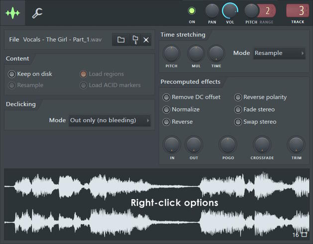 Чтобы узнать больше об особенностях удаления щелчков, которые имеются при нарезке аудио клипа см. [[ | Чтобы узнать больше об особенностях удаления щелчков, которые имеются при нарезке аудио клипа см. [[Fl studio Sampler#Declicking (удаление щелчков)|настройки Sampler - удаление щелчков]]. | ||