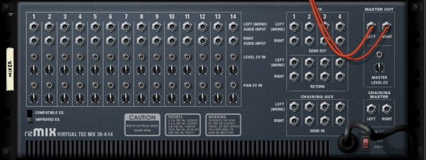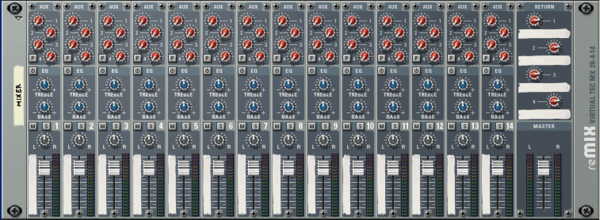 Микшер 14:2 содержит 14 стереофонических каналов. Это программная эмуляция натурального студийного микшера с фейдерами, эквалайзерами, возможностью подключения до четырех параллельных эффектов (Aux). Чтобы увидеть микшер с стороны коммутации, необходимо щелкнуть кнопкой Tab на клавиатуре. Можно вводить в программу различное количество микшеров, соединяя кабели с выхода одного микшера на вход другого. Каждая линейка микшера содержит следующие элементы: