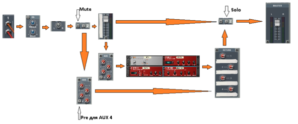 Если необходимо параллельно подключить эффекты, то следует воспользоваться цепочкой AUX-«посыла-возврата». Cзадней микшера есть специальная панель для подключения AUX эффектов. Конфигурация может быть любой. Send Out – это посыл сигнала на эффект-процессор или даже на целую цепочку из них, Return – возврат уже обработанного сигнала. На микшере для каждого канала предусмотрены по четыре ручки, с помощью которых можно управлять уровнями посылаемых на эффекты сигналов. Эффект примешивается к основному сигналу. Такое подключение называется параллельным. Стоит выделить режим префэйдера для AUX4. Если в стандартном варианте сигнал ответвляется сразу после фэйдера, благодаря чему уровень посылаемого на эффект звука состоит из двух составляющих – значения громкости на фэйдере и уровня посыла AUX, то в режиме «пре-фэйдер» первая составляющая обходится.