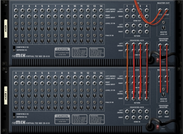 В процессе работы может понадобиться музыкальных каналов больше, чем возможности одного микшера. Можно подключать микшеры в цепочку, для этого достаточно соединить линейный выход нового (Master out) с входом (Chaining Master) старого. При этом в данном случае мастер-фэйдер последнего управляет общей громкостью для двух микшеров. Новому микшеру потребуется свой набор AUX-эффектов, но это можно и обойти, подключив его выходы AUX Send ко входам главного – Chaining AUX, как это показано на рисунке. Соединения микшеров в цепь при их добавлении происходит автоматически, то есть вручную, без необходимости переключения.