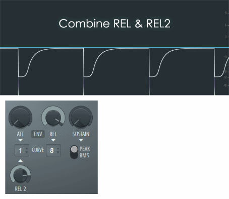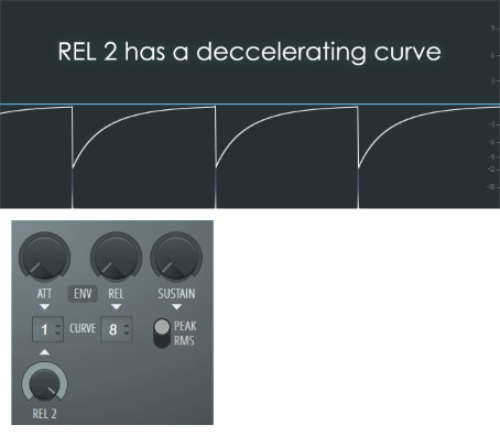 *'''REL2''' - второе время восстановления (в мс). Восстановление 2 тонко подстраивает форму огибающей восстановления. Если '''восстановление 2 = 0''' это будет ровняться времени атаки. Как правило нет необходимости настраивать это значение.