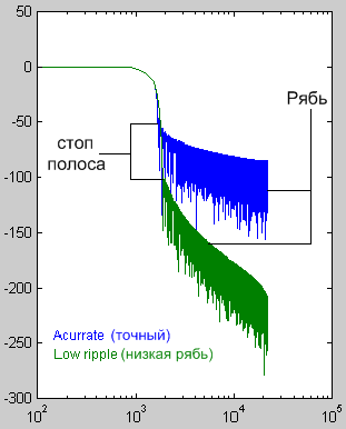Такчто стоп полоса происходит на более низких значениях '''Gain''', которые нельзя увидеть на графике LinEQ при разрешении +/-30 дБ. Её можно рассмотреть в спектральном анализаторе, который имеет более высокое разрешение. Чем мудрёнее звук, тем выше стоп полоса и тем слышнее окраска звука рябью. Цель заключается в достижении лучших результатов, которые могут различаться для различных пользователей и ситуаций. В некоторых случаях рябь может находится на уровне -60dB, что может являться незначительным или приемлемым компромиссом по отношению к крутизне склона. Иногда выбор менее точного метода и корректировка обрезания компенсирует склон и контролирует путь его прохождения.