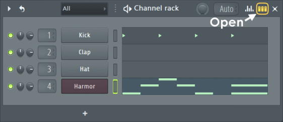 • Каждая строка в окне пошагового секвенсора принадлежит к одному инструменту и связанная с этой строкой последовательность будет воспроизводится только этим инструментом. Слева направо вы увидите регуляторы панорамы, уровня, кнопку инструмента (открывает интерфейс инструмента) и кнопки пошагового секвенсора или предпросмотр пианоролла, в зависимости от того как был настроен инструмент.