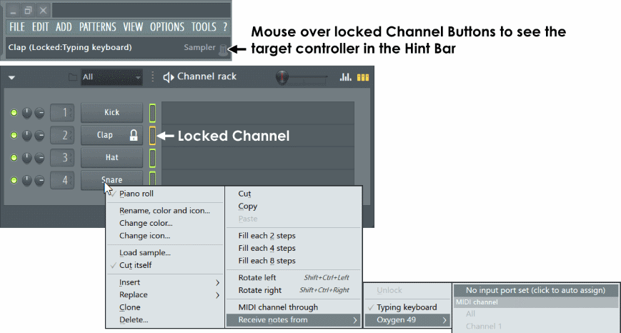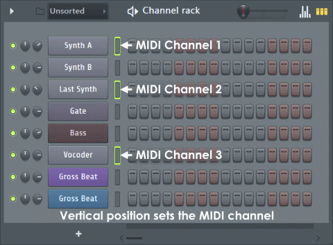 Этот метод менее жёсткий, чем Receive notes from, описанный выше, и так это работало в FL Studio до FL Studio версии 12.3. Выбранные инструменты назначаются на контроллеры на основе их номера MIDI-канала. Чтобы этот метод работал, вы должны установить каждый контроллер для передачи по уникальному MIDI-каналу (то есть от 1 до 16). Самый низкий MIDI-канал будет управлять самым верхним выбранным инструментом, а самый высокий MIDI-канал - самым нижним выбранным инструментом (см. картинку ниже).