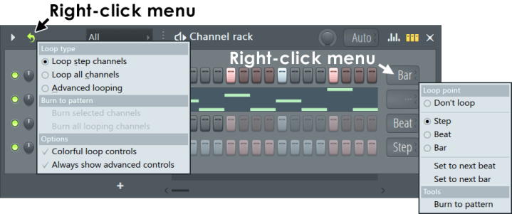 Когда включено, инструменты будут зацикливать свои последовательности независимо от длины других последовательностей. Значок зацикливания (щелкните правой кнопкой мыши, чтобы открыть дополнительные параметры). Когда зацикливание включено и выбрано '''Loop all steps''' (''зациклить все шаги'') пошаговый секвенсор будет зацикливать все инструменты, чтобы они соответствовали самой длинной последовательности в паттерне. Это повторяет режим зацикливания инструментов из '''FL Studio 11'''. При зацикливании отображаются «призрачные шаги», чтобы показать, как зацикливаются инструменты. Щелкните правой кнопкой мыши по значку зацикливания, чтобы получить доступ к дополнительным параметрам: