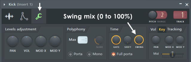 *'''Set swin gmix for selected''' (''установить свингмикс для выбранных'') - устанавливает параметр 'Настройки инструмента Miscellaneous > Time > [[#4. Глобальный свинг|Swing]]' для выбранных инструментов. Это позволяет вам быстро и независимо настроить свинг для выбранного инструмента/инструментов, по умолчанию Swing Mix установлен в 100% для всех инструментов, и поэтому все они реагируют на настройку Global Swing.
