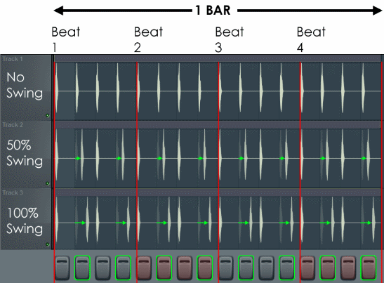 *'''Set truncate swing notes for selected''' (установить усечение свинговых нот для выбранных) — когда включён свинг, сохранение длины нот может привести к их наложению на следующие ноты. При наложении нот могут возникнуть нежелательные эффекты, такие как монофонический портаменто, слайды, обрывы нот или пропуск следующей ноты.