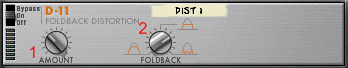 - Foldback - параметр настраивает характер искажения, возвращая их назад, что делает характер сигнала более сложным. Значение по умолчанию находится в среднем положении. Это приводит к "плоскому" отсечению пиков волны, что является наиболее распространенным типом искажений. Снижение параметра делает звучание округлее и более мягким, поднимая параметр звучание становится более резким и злым.