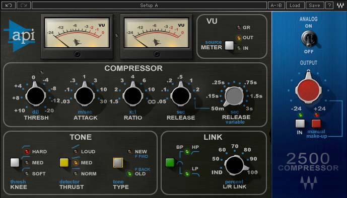 Для тех из вас, кто является опытным пользователем инструментов предназначенных для обработки звуковых сигналов, мы рекомендуем подойти к API 2500, как и к любому другому компрессору, с которыми вы уже знакомы. Имейте в виду, что его параметры Thrust, Type, и Knee предлагают возможности, которые не входят в другие, более традиционные процессоры.