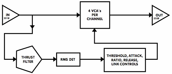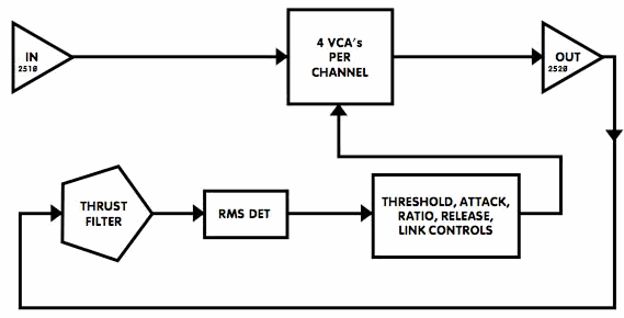 Thrust (сила реакции), запатентованный процесс, который вставляет фильтр пропускающий высокие частоты на входе RMS детектора, ограничивая реакцию компрессора на низкие частоты одновременно применяя дополнительное сжатие к более высоким.