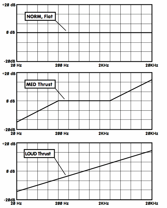 - Thrust (сила реакции) - устанавливает силу реакции, это запатентованный процесс, который вставляет фильтр пропускающий высокие частоты на входе RMS детектора, ограничивая реакцию компрессора на низкие частоты одновременно применяя дополнительное сжатие к более высоким.