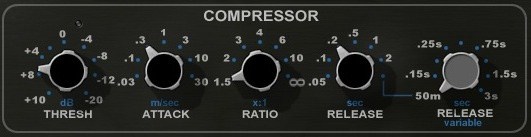 - Ratio (восстановление) - устанавливает время восстановления компрессора. Если время Release установлено в значение Variable (переменное), то время восстановления находится под управлением регулятора Variable Release, который расположен правее.