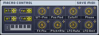 Кроме того, макро-контроллеры позволяют сделать удобным доступ к привилегированным параметрам данного звука, функциональности которая особенно пригодится в ситуациях живого выступления. Например, вы можете изменить частотный спектр звука, изменяя частоту среза фильтра; Однако, вы можете изменить частотный спектр путём изменения параметра позиции волновой таблицы, чтобы изменить базовую форму волны, используемую для генерации звука. Вы можете использовать макро-контроллер для упрощённого доступа к этим важнейшим параметрам, поставив их всех в одно место, где вы можете легко работать с ними.
