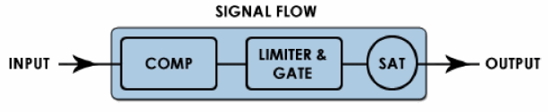 Сигнал идёт от входа в компрессор (COMP), усиление, лимитер (со встроенным шумовым гейтом), сатуратор (SAT), и наконец на выход плагина.